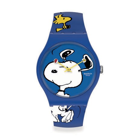 バイオ素材でソリッドなマットダークブルーのケースと、それにマッチした控えめなマルチカラープリントのシリコンストラップ、ソリッドなマットホワイトのプラスチック製バックルが特徴のスヌーピー&ウッドストック ウォッチ。