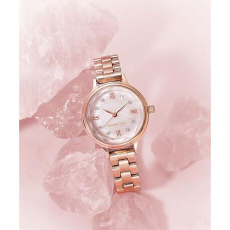 ◇Samantha Tiara(サマンサティアラ)のローズクォーツウォッチローズクォーツのピンク色の文字盤が優しいオーラを放つ腕時計。フェイスのカットガラスがキラキラと輝き、ローズクォーツの優しいピンク色を引き立ててくれます。肌馴染みの良いピンク色でまとまった時計は、オフィスシーンやデートシーンにも活躍してくれる。身に着ける人を優しく守ってくれる癒しのエネルギーを放つローズクォーツは内面の美しさを輝かせてくれるといわれいます。天然石ならではのひび割れのようなクラック模様が光を受けてやわらかな輝きを放ち腕元を彩ります。■文字盤に使用しているローズクォーツは天然石材を選んでいるため、石の結晶化する過程で生まれた筋目や割れ目のクラックがあります。クラックの入り方は様々で個体差があります。クラックが入っている事で光の反射でキラキラと輝いたり、やわらかな輝きを感じられます。※ジュエリーBOXは時期により画像のものと異なる場合がございます。予めご了承くださいませ。