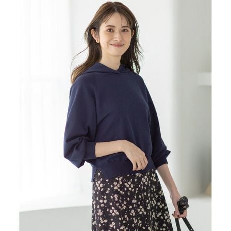 袖口タックディテールがポイントのニットフーディー。一見カジュアルなアイテムのフーディーですが、ニット素材にすることできれい見えなデザインにしています。ほどよくふんわりとした袖が女性らしい優しい印象になるので、フレアスカートやギャザースカートとの相性も抜群です。丈も長すぎない為、ウエスト位置が高く見え、スタイルアップ効果も期待できます。カラー展開はお肌映え抜群なローズ系(#011)、ほんのり甘さをプラスするベージュ系(#033)、シックに決まるネイビー(#075)の3色展開です。