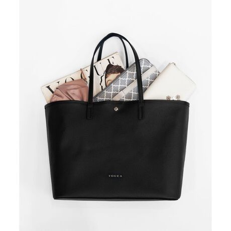 表面にPVCコーティングした、とっても軽いキャンバストート。水をはじきやすくレザー見えするリュクスな素材感が特徴です。ボディーの内側は、表と異なるカラーのベースにアイコンのチェッカークローバー柄をプリント。ハンドルには牛床革を使用し、シンプルな中にもTOCCAらしいほんのりフェミニンで上品なディテールが光ります。便利な程よいサイズ感で、通勤用はもちろんデイリーバッグとしてもおすすめです。