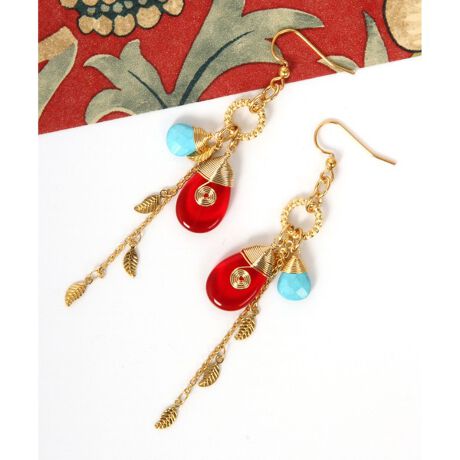 ワイスチャームの【装飾チェコガラス】レッド×サックスリーフチェーンピアス。