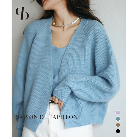 ボタンなどの留め具のないガウンタイプのボタンレスカーディガン。