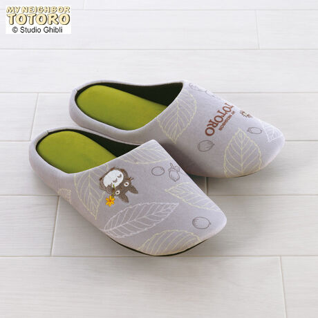 [型番:TOドングリトトロSP]トトロの世界観を感じるようなグレー/グリーンの配色と、ワンポイントのトトロの刺繍が可愛らしい、室内用スリッパ(内寸・約24.0cm)、となりのトトロ・どんぐりトトロ。左右の足の形に優しくフィットし、軽い履き心地でふっくらやわらか。中板部分がワイドでゆったり広めなので、リラックスして履けます。洗濯機で丸洗いできるので、衛生的。ウオッシャブル(タンブラー乾燥は不可)。裏面は滑りにくく、静音効果。