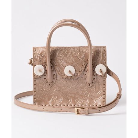 愛らしいコンパクトサイズが印象的なMaestra。品のあるメタリックなブロンズカラーが、より女性らしさを惹き立てます。ショルダーストラップがセットしているので、肩掛けや斜め掛けを楽しめるのも魅力。カジュアルにもフェミニンにも取り入れやすい一品です。1つ1つメキシコの職人が手で彫っている柄が印象的なグレースコンチネンタル定番カービングシリーズ。使用するごとに人それぞれの風合いが出るので、自分だけのヴィンテージ感を楽しめます。どんなスタイリングとも相性が良く、持つだけでコーディネートが引き締まるので、愛用者の多いバッグです。※天然皮革製品の購入にあたっての注意点※天然素材を使用し、手作業を加えている為一点一点風合いや色の出方・サイズが若干異なります。予めご了承下さいませ。この製品は天然皮革を使用していますので、使用を重ねるうちに色合いや風合いの変化などが見られます。使用中に摩擦により多少染料が他のものに付くことがあります。必要以上に摩擦しないよう注意して下さい。淡い色の衣類との着用は出来るだけお避け下さい。雨や汗、水に濡れた場合は特に移染しやすくなります。出来るだけ濡らさないように注意してください。乾燥させる場合は必ず陰干ししてください。天日、直火は硬化の原因になりますので、絶対にお避け下さい。日光や蛍光灯の光、熱、湿気は変質、変色、硬化、カビの原因になりますのでくれぐれも注意ください。