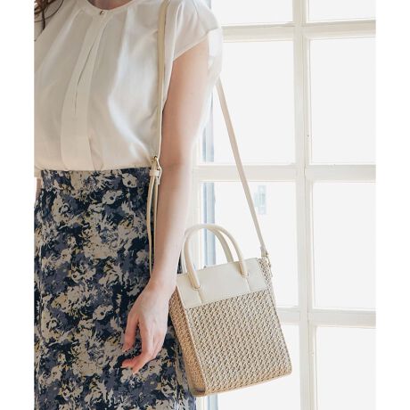 2. 天然見え素材とフェイクレザーのコンビで、カジュアルになりすぎず、きれいめスタイルでも持てるバッグです。