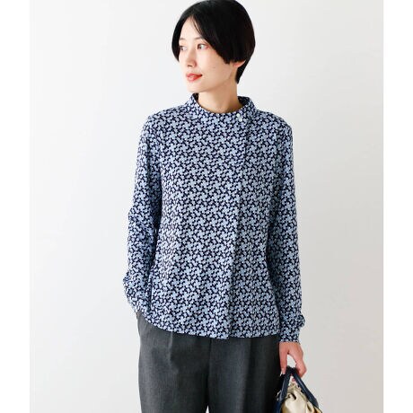 程よくゆとりのあるオフハイネックの長袖プルオーバー。柄が引き立つシンプルなデザインをベースに、アシンメトリーなボタン開きとタックを入れ、さりげないアクセントをプラスしました。ブラウスライクに着まわせる上品なルックスで、ジャケットのインナーとしてもおすすめです。