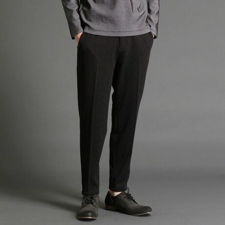 凹凸のあるジャカード生地を使用したイージーパンツ。ベルトループ付きですが、ドローコードを裏側に通しているのでベルトレスでも、ベルトを付けたスタイリングも楽しんで頂けます。腰回りにゆとりを出しながらテーパードした綺麗なシルエット、伸びを活かした縫製仕様にする事で穿き心地を良くしています。表地には凹凸のある変形組織のジャカード生地を使用。膨らみのあるはっきりとした柄感、カットソーならではの高い伸縮性がありながら仕立て映えするしっかりとした張り感があるのが特長。同素材でジャケットも展開しているのでセットアップでのスタイリングが可能です。