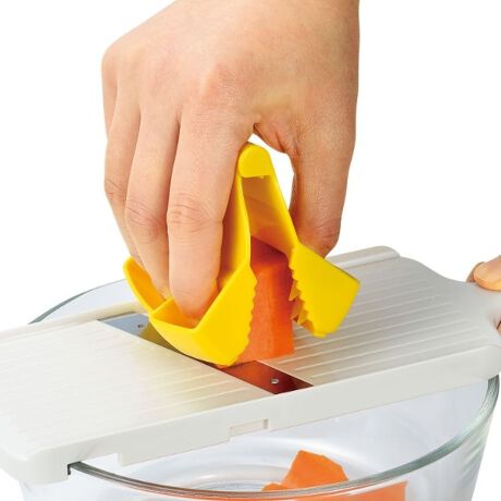 小さくなった野菜をつかんで、指をガード。最後までムダなくスライスできます。