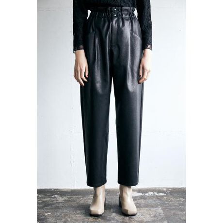 【F/LEATHER GATHER PANTS】ウエストにギャザーが寄ったシルエットがポイントのパンツ。ハイウエストでたっぷりとしたシルエットなので、旬なコンパクトトップスとの相性も抜群です。ややシボ感のあるフェイクレザーを使用しており、高級感のある素材に拘りました。