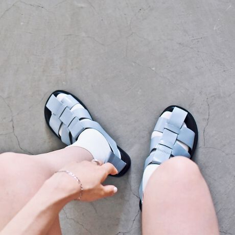 ワイドなラインで組み合わせたアッパーとボリュームソールの相性が良いグルカサンダル。