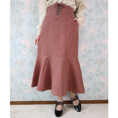 デニムのようなカジュアルな生地なので気軽に履けそう。マーメイドシルエットとウエストの編み上げデザインで女らしさもアップ。