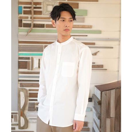 ブロード生地を使用したバンドカラーシャツ。ジャケットのインナーに合わすことで、