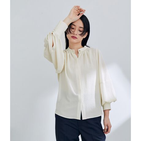 コンパクトな肩幅と、肩から肘にかけてのボリュームスリーブが魅力のブラウス。落ち感のある生地を使用していることで、広がり過ぎず、全体的にフェミニンな印象に仕上げてくれる一着。長めに設定された袖口のカフスが、手首を華奢に見せてくれるのもポイントで、折り返してニュアンスを出すのもおすすめ。襟まわりは、きちんと首に沿うようなスタンドカラーで、スクエア型のボタンがポイントに。前開き部分が比翼仕立てになっていることで、襟元のボタンを引き立ててくれているのもポイント。