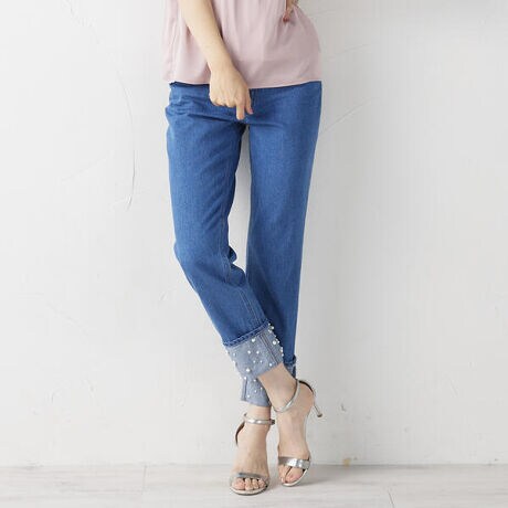 裾の折り返し部分にランダムについたパールがポイントのデニム。\n9.2オンスの定番デニム素材になります。\nデニムはカジュアルになりがちのアイテムですが、パールが付いているのでフェミニン派の方にも様々なアイテムと合わせて着用して頂けます。\nパールは折り返し部分のみに縫い付けているので丈の長さ調整が可能です。\n洗濯機で洗えるイージーケアも嬉しいポイント。\n※プリュス展開あり\n\n■model:165cm 着用サイズ:S\n----------------------------------\n洗濯方法\n家庭洗濯:液温は40℃を限度とし、洗濯機で弱い洗濯ができる。\n自然乾燥:吊り干しがよい。\nアイロン:底面温度150℃を限度としてアイロン仕上げができる。\nドライクリーニング:石油系溶剤による弱いドライクリーニングができる。\n----------------------------------\n\n※画像の商品はサンプルとなりますので実際の商品と仕様、加工、サイズが若干異なる場合がございます。\n※お客様のモニター環境により実際のお色と多少異なる場合がございます。\n\n関連ワード:ジーンズ 10分丈 シンプル ナチュラル フェミニン ガーリー コンサバティブ 無地 ワンポイント