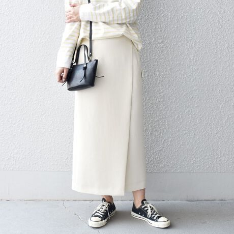 フロントの切り替え部分を斜めにデザインし、ウエスト部分は縫い込んでスッキリ見えするラップスカート。