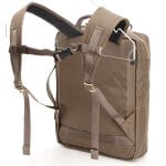2WAYデイパックの背面側には、スマートフォンなどを収納しやすいファスナーポケットを両側に配しています。このポケットはカバン本体を横にするとトロリーバー通しにもなる仕様です。また、カバンの側面にハンドルが付属しているのでブリーフケースのように持つこともできます。
