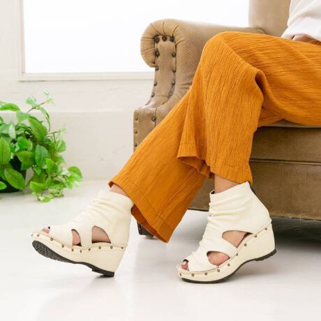 本革ギャザーデザイン厚底バックジップブーツサンダル