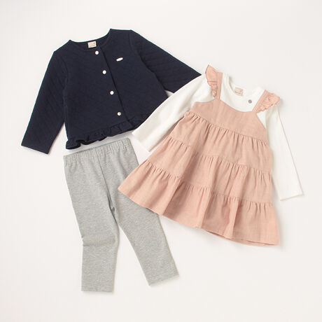 デイリーに着まわしやすい3点セットです。キルティング仕立てのジャケットは、さりげないステッチがシンプルながらもおしゃれな雰囲気。カジュアルとガーリーを両立するティアードデザインのワンピースも魅力ポイントがたっぷりです。レギンスはあえて装飾をつけず、明るめのカラーで華やぎをプラス。トータルコーディネートが楽しめて、お手持ちのアイテムとも合わせられる万能さがうれしいところです。ジャケットとワンピースは両側にポケットを備えています。内側にはお名前を記入できるタグつき。【透け感】透けない【生地の厚さ】普通【伸縮性】あり【裏地】なし※ワンピースのみあり【ポケット】あり※レギンスのみなし【アジャスター】なし≪ジャケットの重さ≫90cm/約160g