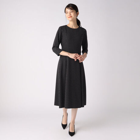 ジャストウエストで切り替えられた、フィット&フレアラインの7分袖のワンピース。クラシカルなドット模様が、着こなしをエレガントに引き立てます。シワになりにくいポリエステル100%素材を使用していて軽やかな着心地です。長いシーズン着回せて、羽織物で季節感の変化をプラスできます。※商品画像はサンプルを使用しているため、実際の商品と色味などの仕様が異なる場合がございます。予めご了承ください。model:T.170/B.80/W.59/H.87着用サイズ:38