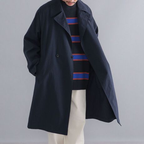 大人が着れるゆったりアウターをテーマに開発した新型アトリエコート\n\n大人が着れるゆったりコートとは何かを起点に、素材、デザインをこだわり抜いた新型アトリエコート。\n素材は、糸にふくらみのあるナイロンタスラン糸を使用し、合繊ながら天然素材のような表情に仕上げたナイロンオックス。小松マテーレによるヴィンテージ加工(SY加工)を施すことで、リラックス感のあるナチュラルな風合いが特徴の良質な生地感となっております。\nデザインは、トレンチベースの襟型に1ボタン仕様(内側のボタンは左肩のストラップから止めることができます)に構築、余計な装飾を省くことによって落ち着きのあるデザインに仕上げています。\n膝下丈のややゆったり目なサイズ感ですが、落ち感のある素材なので野暮ったさは無く、綺麗なAラインシルエットに調整しているため、スラックスからワイドパンツまで上品な印象で着ていただけるアウターにて完成させています。\n\n※画像の商品はサンプルです。\n実際の商品では色味、また一部仕様が変更になる場合もございますので、予めご了承ください。