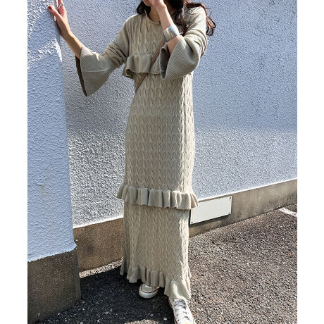身頃の透かし編みとフリルは女性らしい印象にさらに上げてくれるので特別な日に着たくなる1着です♪