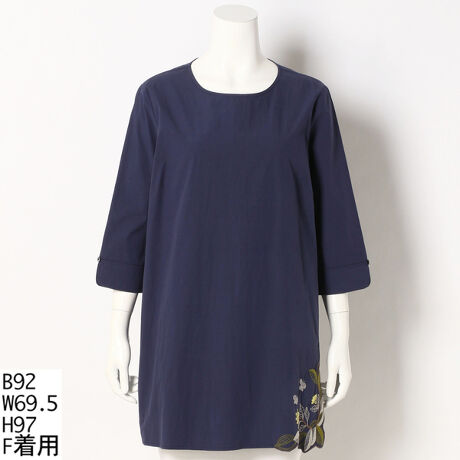 花と蝶をモチーフにしたカットワーク刺繍を施した高級感のある大人可愛いチュニックブラウスです。程よいAラインでスッキリしたシルエットになっています。後に開きがあるので、着脱もしやすいです。[型番:7221712]