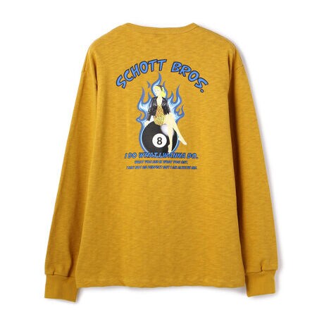 スラブ天竺を使用したクルーネックのロングスリーブ。 ピンナップガール的なグラフィックが印象的で背中にははSCHOTT BROS.が入り、女性のグラフィックと 8 BALL、、ファイヤーパターンで構成されて、プリントで入る。背中の女性のコメントとも取れるメッセージが印象的。左胸にもSCHOTT BROS.がはいります。■お使いのパソコンのモニターによって、実物商品とカラーが異なって見える場合があります。誠に申し訳ございませんが、ご理解下さいます様お願いいたします。■当ショップの在庫数は 直営店舗の商品も含まれています。在庫数が日々変動する為、ご注文頂いた時点で在庫が完売になっている場合がございます。■サイズ表は、製品の生地や織りなどの特性により、多少の誤差はございます。予めご了承ください。【Schott/ショット】 ライダースジャケットの代名詞ともいえるSchottの歴史は、1913年、ニューヨークでアーヴィン・ショットジャックショットの兄弟によって始まった。当初はレインコートを作る工場だったが、1928年に世界で初めてフロントジッパーを採用したライダースジャケット「Perfecto」シリーズを発売。ボタン仕様しかなかった当時、画期的なジャケットとして話題となり、その後のライダース史に大きな影響を与えた。そして、Schottの名を世界に知らしめたのが50年代に発表された星型のスタッズをエポレットに配した伝説のモデル”ワンスター“だ。 この新作こそが、映画『ザ・ワイルド・ワン(邦題「乱暴者」』で、マーロン・ブランドが纏ったと言われているモデルである。その後もラモーンズやセックスピストルズをはじめ、多くのロックミュージシャンに支持され、時代を超えた永遠の番として今なお多くの人々を魅了する。最近では定番モデルだけでなく、カジュアルラインも充実させるなど、常に時代に合わせて進化を遂げる革新性も忘れない。ライダースの歴史は永遠にSchottとともにある。