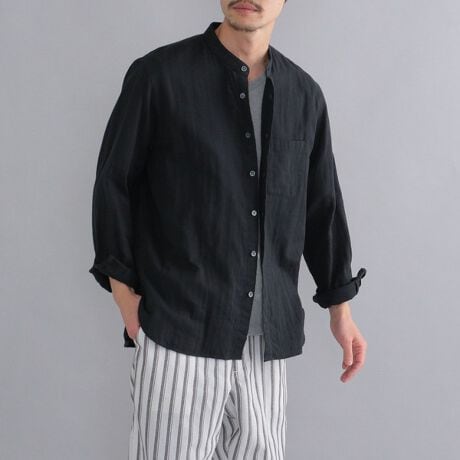 ソフトな肌触りのダブルガーゼ素材を使用した定番バンドカラーシャツ\n\nトルコのオーガニックコットンを使用したダブルガーゼ素材を使用したリラックスシルエットのバンドカラーネルシャツ。\nオーガニックの良さがふんだんに出るように、ソフトなワッシャー加工を施し膨らみのある生地感に仕上げています。ガーゼ素材ならではの柔らかい肌触りと、オーガニックコットンのナチュラルな表情が合わさった風合いの良さがポイントです。\n襟は抜け感のあるバンドカラーデザイン、緩やかにラウンドした裾のカッティング等、羽織りとしてのバランス感も考えてパターンを制作。サイズ感を若干大きく微調整し、シャツアウターとしても着れるサイズ感に修正しています。\nガーゼのナチュラルなシワ感による表情は、羽織りや一枚着としてシンプルなスタイリングに映える一着となっております。\n\n※画像の商品はサンプルです。\n実際の商品と仕様、加工、カラー等が若干異なる場合がございます。