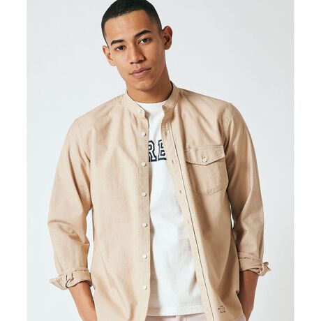 Jプレスのオックスガーメントダイ バンドカラーパッチフラップポケットシャツ。