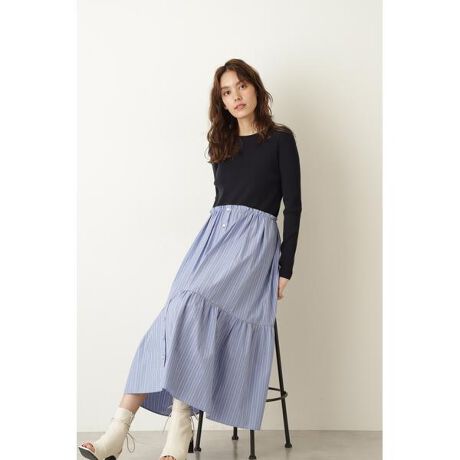 一着でスタイルが決まり、デイリーに活躍できるドッキングワンピースニットは合繊糸で細リブに編み立て、スカート部分はキレイなカラーストライプのシャツ生地をドッキングしたデザイン。ウエスト部分はシャツ生地の縫い代を表にだすことでINしたようなポイントとなり、着用しやすいデザインに仕上げました。さらにタック&ギャザーの切り替えでボリュームが増し、フロントボタンで縦長シルエットを強調するようにアクセントをつけています。※後ろファスナーで着脱しやすい仕様・スカート部分のみ裏地付き