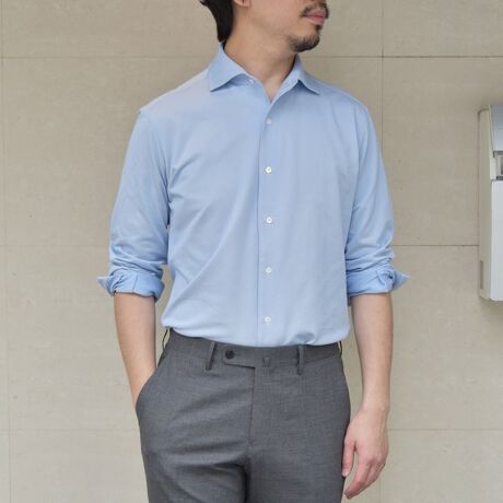 『ALBINI社の糸を使用した、リラックス感のあるジャージ素材のワンピースカラーシャツ』