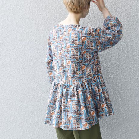 伝統菓子カリソン・デクスの形をランダムに配置したオリジナルプリント素材を使用したチュニックブラウス。