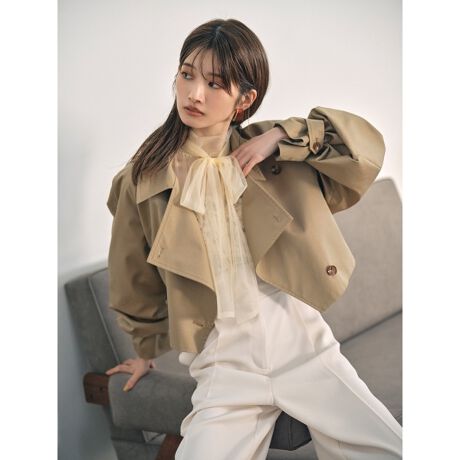 女性らしい丸みのある変形シルエット&ショート丈で、トレンドライクに仕上げたトレンチコート。すっきりと見えるようにと計算されたバックウエストの飾りベルトが、後ろ姿をモードに映し出しています。フロントボタンを開けて今年らしくルーズに着こなすのがオススメ。袖口はあえて広めに設計しているので、タブベルトでキュッと絞ってアレンジも楽しめます。繊細なフロッキーオーガンジーブラウス(LWFT221072)のような女性らしいアイテムとの組み合わせが◎。