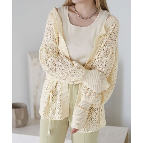 透かし編みがかわいいニットカーディガン。共地のベルトがついているのと、前後2wayで着用いただけるので様々な着こなしができる優秀なアイテムです◎