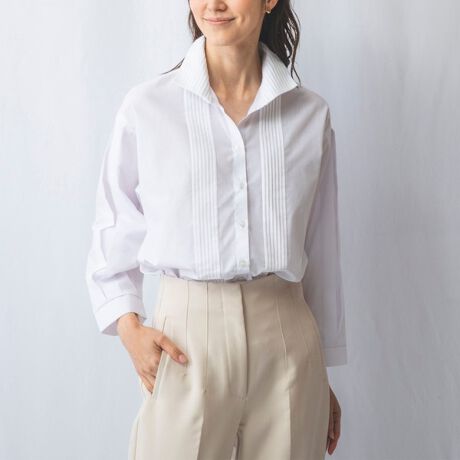 ナラカミーチェの伝統的なピエゴリーネで、クラシックな印象に仕上げたシャツ。高さのあるスタンドカラーが、顔周りをシャープに見せてくれます。要所のタックワークで、着こなしに奥行きと表情をプラス。ほんのりと透けのある軽やかな素材を使用して、ドレッシーなムードを演出します。長すぎず短すぎない適度な着丈で、ボトムスを選ばないアイテムです。