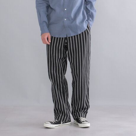 上品なワイドシルエットのリネン混イージーパンツ\n\nポリエステル/コットン/麻/レーヨンの4者混の平織り素材を使用したイージーパンツ。\n柔らかくソフトな風合いが特徴で、程よい落ち感もポイントの春〜夏に最適な生地感です。ご家庭で洗濯機洗いが可能です。\n繊細且つ落ち着いた絶妙な配色のストライプが脚長効果に一役買っており、ゆったりめのシルエットですがだらしなく見えることはなく、上品な雰囲気に仕上げています。\nサイズ感はヒップ、ワタリを広く設定し、裾にかけて微妙にテーパードを利かせた、野暮ったさを感じない大人の夏のリラックスシルエットに構築。\nウエストゴムは後身頃から前身頃のベルトループ付近まで入れることでフィット感を重視し、インもアウトも使い分け可能なドローコード付きでストレス無くお穿きいただけます。股下はワンクッション程度のゆとりを持たせたジャストレングス仕様。\n生地の落ち感と上品なストライプ柄により、だらしなく見えがちなワイドパンツを大人が穿ける上品な印象へと昇華しています。ワイドシルエットになり過ぎない絶妙なルーズさで仕上げているため、普段穿いてるパンツのシルエットに飽きた方や、アクセントを加えたい方に是非おすすめしたいアイテムとなっております。もちろんサンダルとの相性も◎。バスクシャツやリネンシャツと合わせた清涼感のあるコーディネートがおススメです。\n\n※画像の商品はサンプルです。\n実際の商品と仕様、加工、カラー等が若干異なる場合がございます。