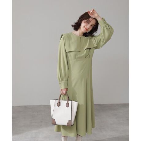トレンドライクなスクエアカラー付ワンピース。襟は取り外し可能なので、シンプルなネックラインのワンピースとしても着られます。ウエスト位置を高く切り替えているので、スタイルアップ効果を期待できるデザイン。さらにウエスト後ろはゴムでフィットしつつ、共布リボンを結ぶとサイズ調節ができます。襟の付け替えで違った表情のスタイリングを楽しめます。