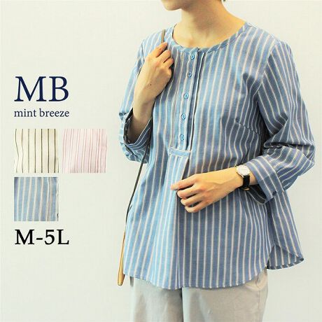 明るいカラーのストライプ柄でフロントのピンタックとボタンがデザインポイントです。