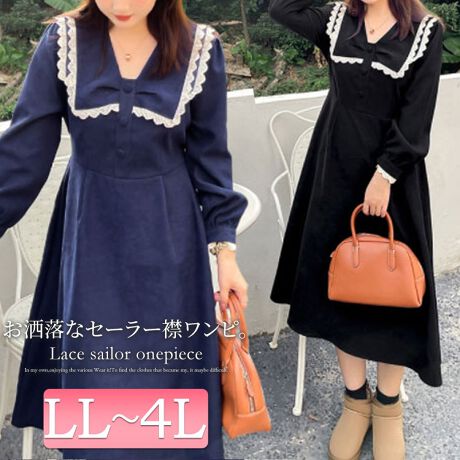 【LL-5L】セーラーカラーフレアワンピース 大きいサイズ レディース ワンピース ワンピ 長袖 冬