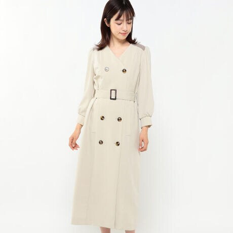 抜群の存在感を放つ、トレンチ風のデザインワンピース。ボリューム感のある袖やボタンのアクセントと、衿なしであっさりと仕上げた首元のギャップが女性らしい雰囲気の1枚。太めのバックル付きベルトでスタイルアップ効果も期待できます。