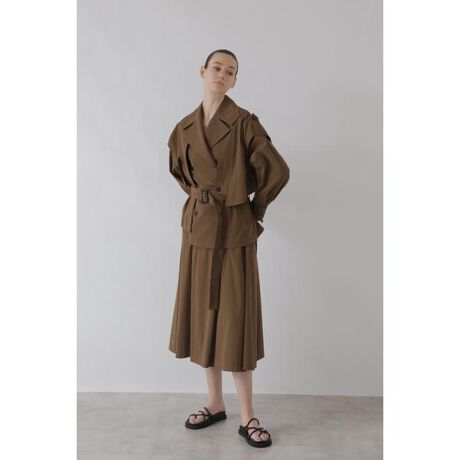 フロントは斜めダーツからタップリとフレアーをとって、バックはミドルヒップがほんのりと膨らむようにつまみコバステッチと入れ拘ったカッティングでフォルム感を出したフレアースカートです。タテ糸にはコットン、ヨコ糸にはナイロンを高密度に打ち込んだベネシャン素材。特殊加工を施し素材に高反発性とドレープ性を与えています。同素材のジャケットと合わせるとSTYLISHなコーディネートやギャザースリーブニットと合わせるとフェミニンなコーディネートに。