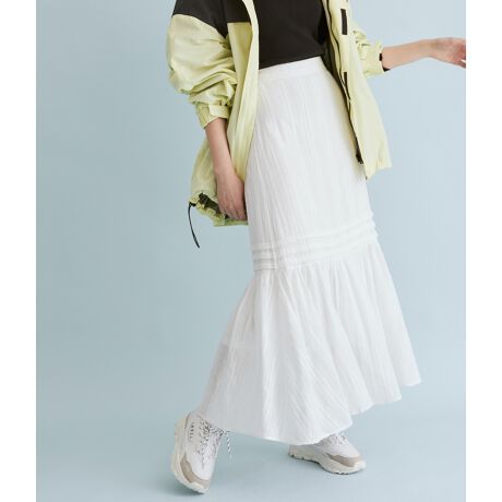 スタイルを良く見えるように、ティアードでありつつ大げさなボリュームではなく程よく入れているのでアウターなどのシルエットを邪魔せずに合わせられるようにしています。