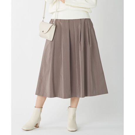 すっきり見えする、エレガントなタック入りスカート■デザイン上品でエレガントな、女性らしいタックフレアースカートです。タック入りですが、前から見たときにすっきり見えるデザインにしました。後ろウエスト部分はゴム仕様にしているので、大変履きやすくなっております。ニットにも合わせられて単品使いも出来る万能なアイテムです。総裏ありです。■素材東レ(株)のアーティローザディノーバという割繊糸を使用した、高密度素材です。東レ(株)ならではの、繊細な細番手、割繊糸を使用しており、仕上げで割繊させているため、繊細なピーチタッチを表現しています。似寄り生地と比較しましても、ワンランク上の製品映えが見込まれる素材です。※商品画像はサンプルを使用しているため、色味やサイズ等の仕様に変更がある場合がございますので、予めご了承ください。