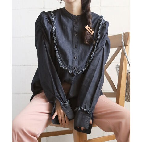 シャツにぴったりの4.5ozデニムはお袖のギャザーもごわつくことなくフリンジもきれいに見せてくれる仕様。