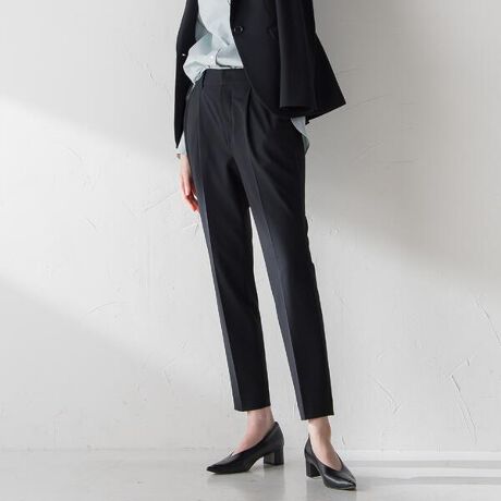 【デザインの特徴】ウエストアジャスター仕様のペグトップパンツ。ウエストは内側のタブでサイズ調節ができる仕様になっていますので一見きれいなパンツに見えます。\nウエストゴム仕様の波うちがない為とても美しいシルエットが完成。\nタック入りですがポケットの袋布でおなか周りを押さえてタックが開きにくい仕様になっています。\nややゆとりのあるシルエットなので体のラインを拾いにくくなっています。そう素材のジャケット(3605-21030)とセットアップとしてもお使いいただけます。\n\nネイビーはブラックに近い濃紺です。\n\n【素材の特徴】\nhaute(高級な)+technology(技術)=HAUTEC 究極の着心地、履き心地を追求したラエフオリジナル素材です。\n高密度な織り、伸縮性の強いライクラファイバーを撚糸することにによるハイストレッチはそのままに、今シーズンはより細番の糸使いで撚糸回数を上げることで、よりしなやかで繊細な生地に仕上げており、且つ着用期間が長い素材となっております。\nスッキリシャープに見える素材感でありながら、着用したときの2WAYに伸びるストレッチの柔らかさがポイントです。\n----------------------------------\n洗濯方法\n家庭洗濯:液温は30℃を限度とし、洗濯機で非常に弱い洗濯ができる。\n自然乾燥:吊り干しがよい。\nアイロン:底面温度110℃を限度としてアイロン仕上げができる。\nドライクリーニング:石油系溶剤による弱いドライクリーニングができる。\n----------------------------------\n\n■モデル身長 173cm/着用サイズ 9号\n\n**********************\n透け感:なし\n伸縮:あり\n光沢感:なし\n生地の厚さ:普通\n**********************\n【スタッフ着用コメント】\n身長:165cm/普段サイズ:7号または9号/着用サイズ:7号/着用カラー:13\nほぼ毎日履いていますが、センタープレスがほとんど取れない。シワも洗ってしまえば綺麗に戻るのでアイロンの必要はありません。ウエストの調節ができるのですが、トップスで隠してしまえば生地の寄り感も気になりません。\n\n※画像の商品はサン