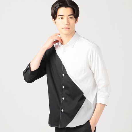 3種類の素材をパネルで切り替えたショートレギュラーカラーの7分丈シャツ。サイズはゆったりめに設定していますが、ウエストに絞りを入れることでシャープな印象になる様に仕上げています。生地には綿ナイロンの先染めブロード、ツイル、ハケメ素材を採用。柔らかな風合いとナイロンの持つ上品な光沢、ストレッチの効いたストレスフリーな着心地が特長です。