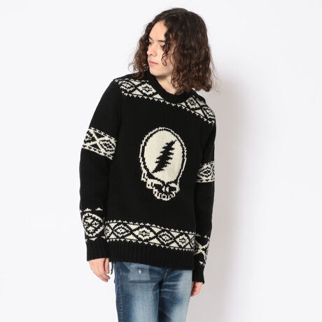Schott×GRATEFUL DEAD(グレイトフルデッド) STILL YOUR FACE SWEATERウール80%×ナイロン20%の毛糸をしっかりと編み込んでいます。首元はクルーネックを採用していてカジュアルな印象を与えます。デザインにはカウチンセーターの織り込み模様でもよく目にする幾何学模様を織り込み、グレイトフルデッドのスティール・ユア・フェイススカル(デッド ヘッド)をフロントセンターに大胆にレイアウトしています。幾何学模様はフェアアイル織りが起源で、そのフェアアイル模様とスティーリーヘッドが、ブラック×ホワイトのシンプルな色合いでありながら印象的なデザインが魅力です。【Schott/ショット】ライダースジャケットの代名詞ともいえるSchottの歴史は、1913年、ニューヨークでアーヴィン・ショットジャックショットの兄弟によって始まった。当初はレインコートを作る工場だったが、1928年に世界で初めてフロントジッパーを採用したライダースジャケット「Perfecto」シリーズを発売。ボタン仕様しかなかった当時、画期的なジャケットとして話題となり、その後のライダース史に大きな影響を与えた。そして、Schottの名を世界に知らしめたのが50年代に発表された星型のスタッズをエポレットに配した伝説のモデル”ワンスター“だ。 この新作こそが、映画『ザ・ワイルド・ワン(邦題「乱暴者」』で、マーロン・ブランドが纏ったと言われているモデルである。その後もラモーンズやセックスピストルズをはじめ、多くのロックミュージシャンに支持され、時代を超えた永遠の番として今なお多くの人々を魅了する。最近では定番モデルだけでなく、カジュアルラインも充実させるなど、常に時代に合わせて進化を遂げる革新性も忘れない。ライダースの歴史は永遠にSchottとともにある。