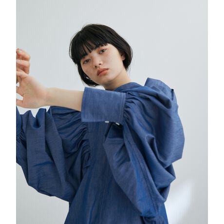 ボタンを前にしても後ろにしても着用可能な、スタンドカラーの2WAYブラウス。大きなアームホールを身頃上に設定し、たっぷりのギャザーとタックを施した、ボリューミーな袖が魅力。袖口にもギャザーを施し、カフスで締めてメリハリを付けているのがポイント。