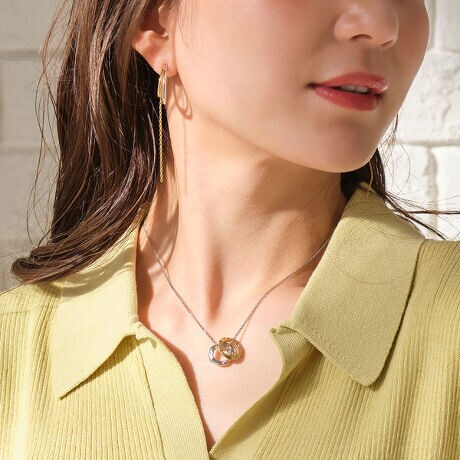 シルバーカラーのチェーンに、2色のリングモチーフを通したモードなデザイン。