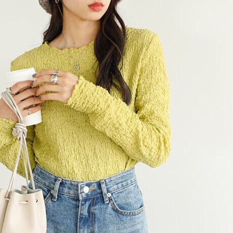 〇凹凸感のあるワッシャー素材がコーディネートにアクセントを